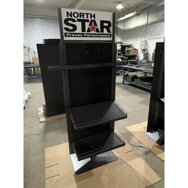 Gondola retail rack with two shelves and a bottom base. Shelves can be adjusted height wise